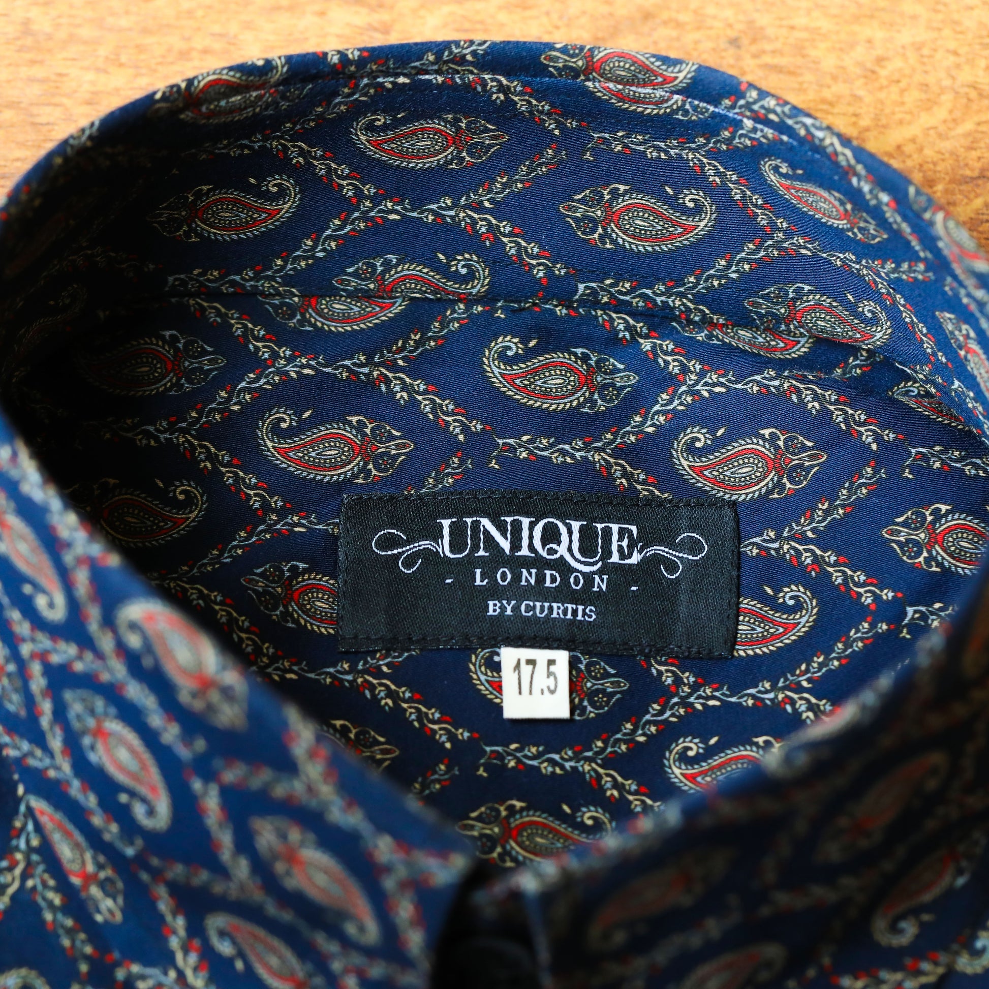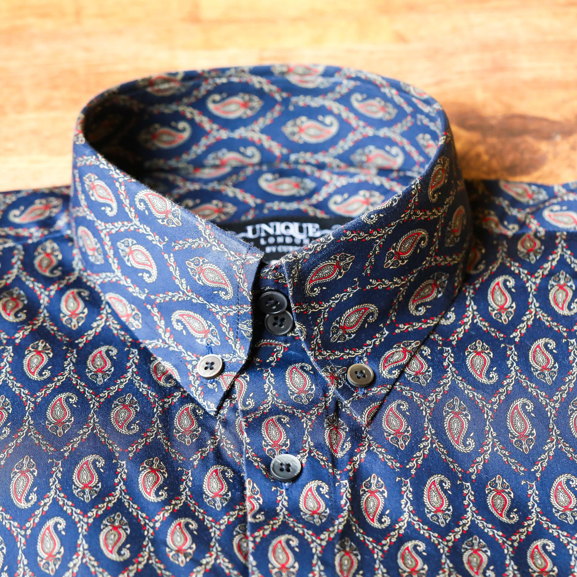 Product tags: mens-shirt, printed-shirt, paisley, navy, slim-fit, cotton, digital-print, smart-casual, evening-wear, UniqueLondon