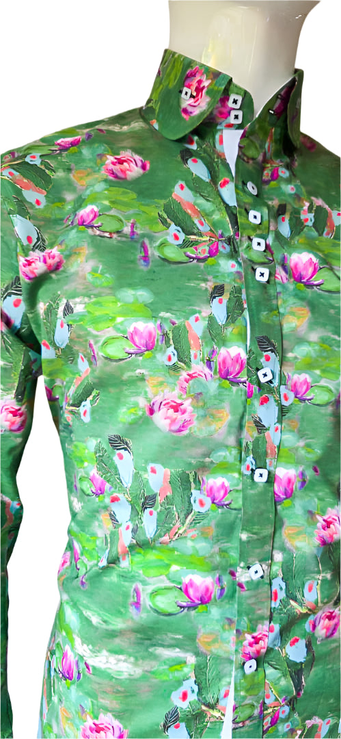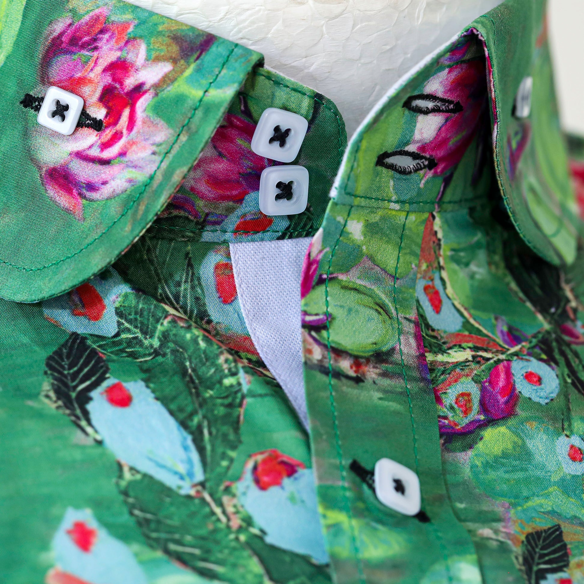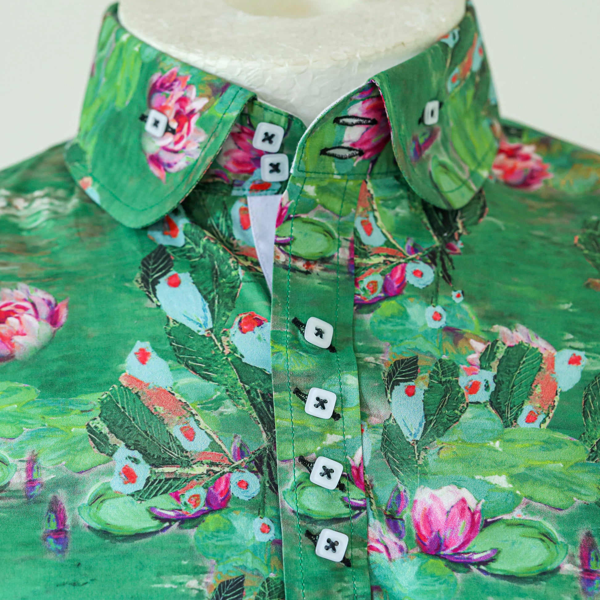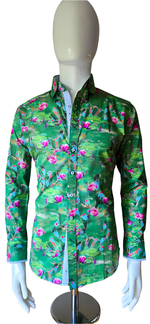 What truly sets this piece apart is the exclusive hand-printed design: a vivid tropical green background filled with flourishing lotus blossoms in rich pink tones, and elegant parrots subtly perched among artistic brush strokes. The painterly effect gives the shirt a luxurious, almost gallery-worthy aesthetic.