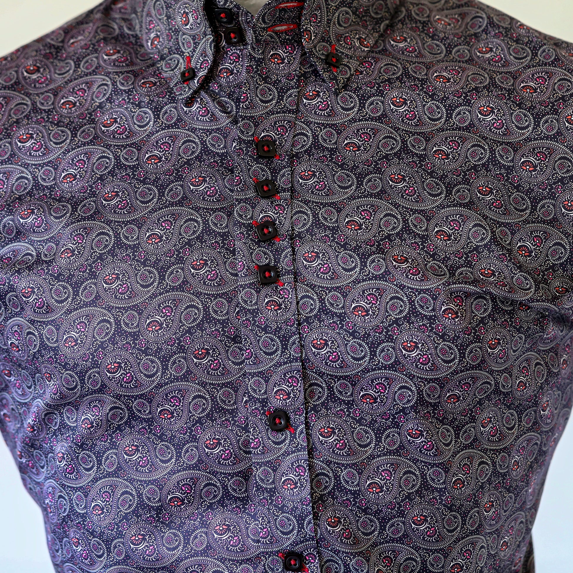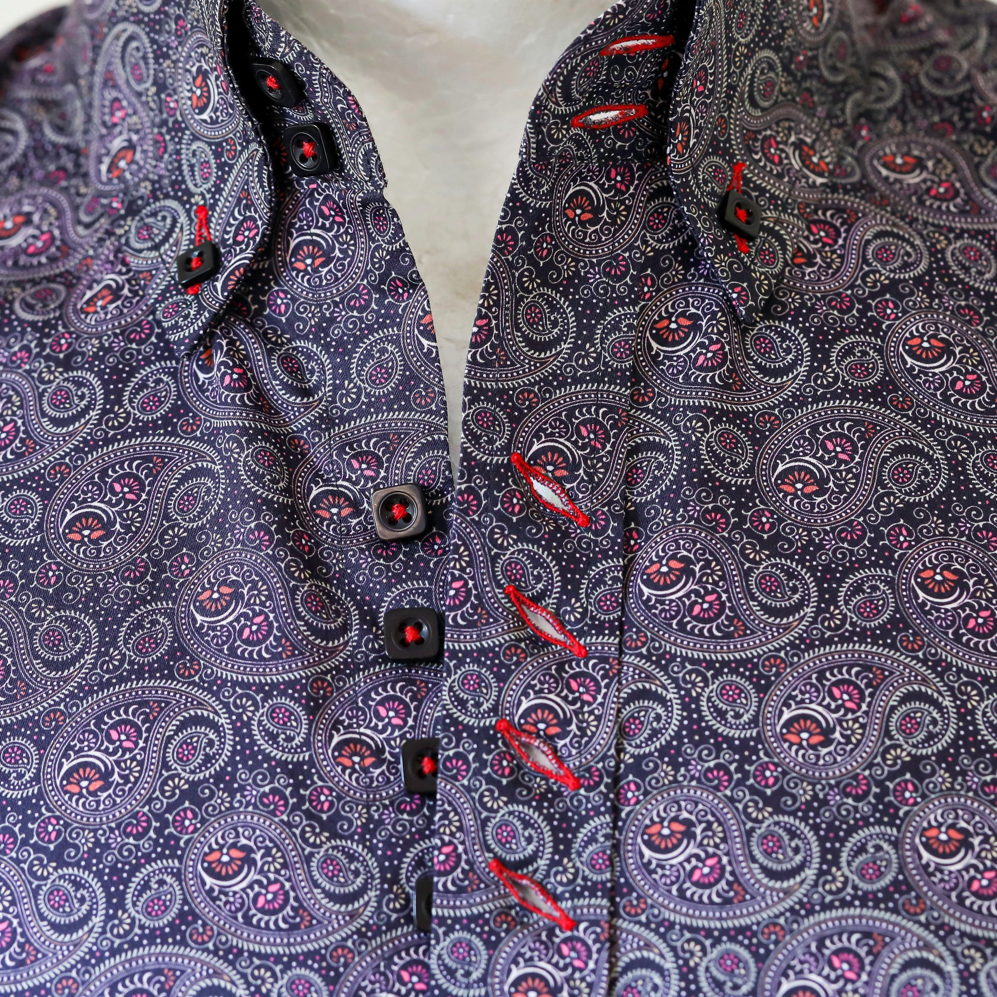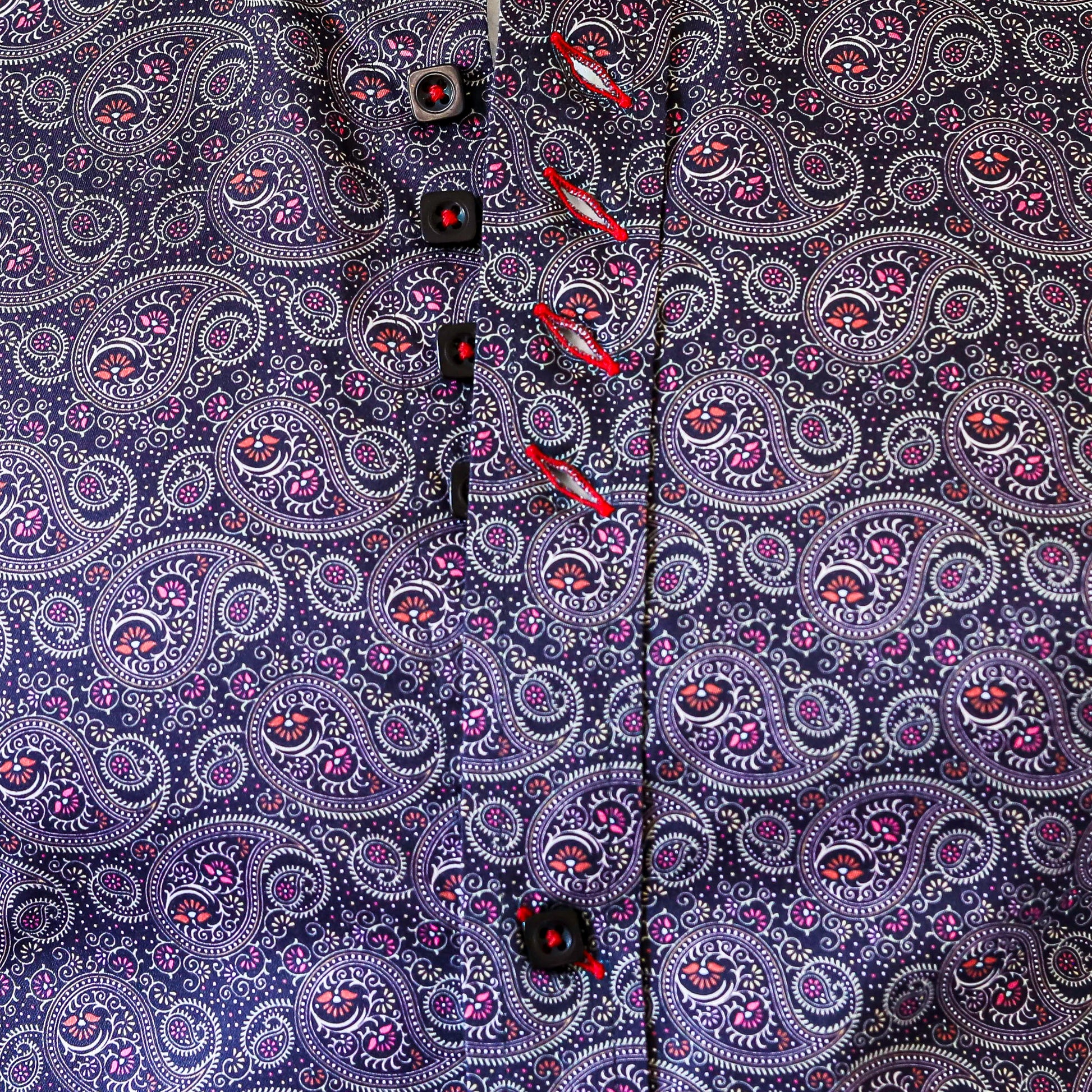 Made from super fine, breathable cotton, this shirt offers a luxuriously soft feel while keeping you comfortable in any setting. Every detail is laser printed with pinpoint precision, ensuring sharp patterns that retain their vibrancy wash after wash. The finishing touches β jet-black buttons stitched with red thread β showcase meticulous attention to detail, highlighting its tailored artistry.