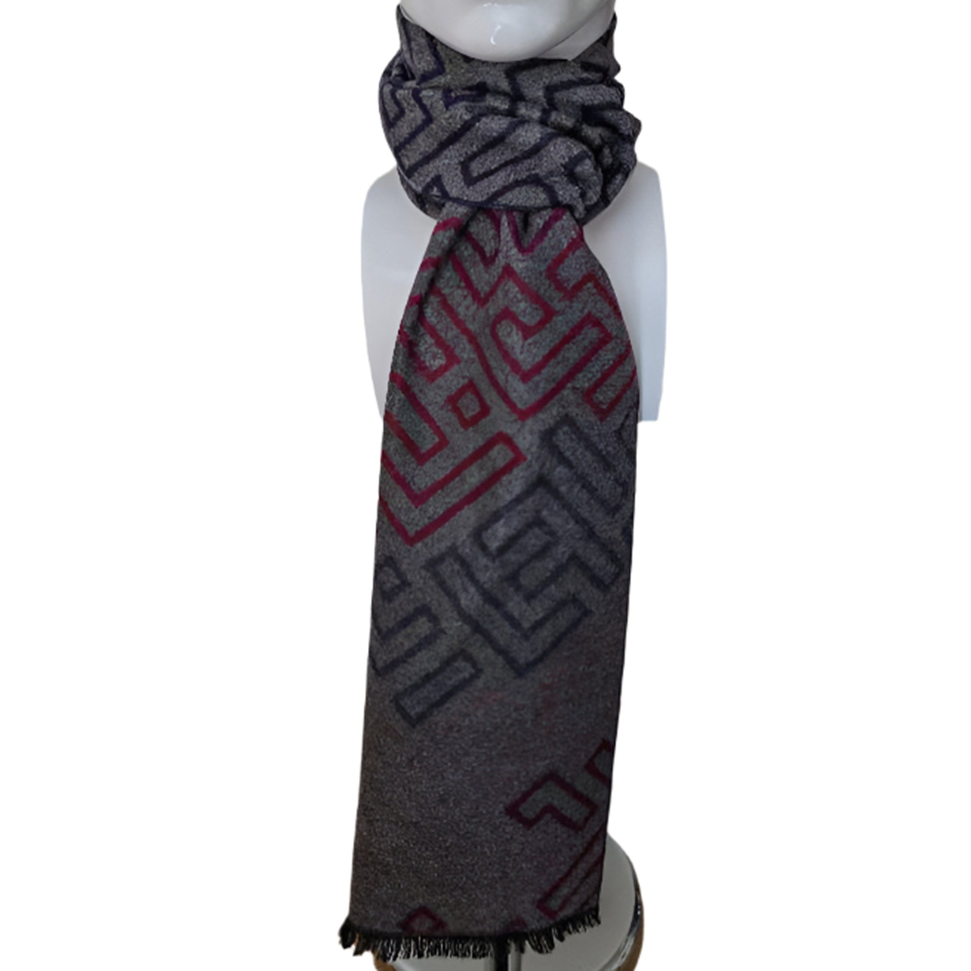 This scarf is not just an accessory — it's a statement. The reversible design gives you two distinctive looks in one piece, making it perfect for transitioning from day to night or from business to casual. One side showcases a bold, geometric-inspired pattern with intricate black detailing, while the reverse offers a softer contrast that highlights the textured depth of the high-grade wool weave.